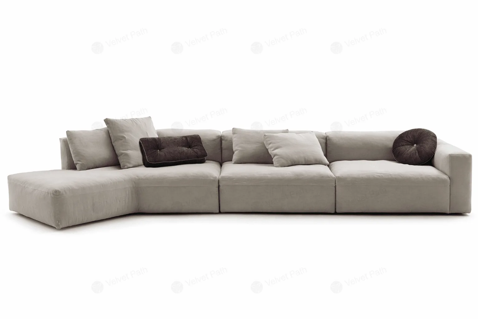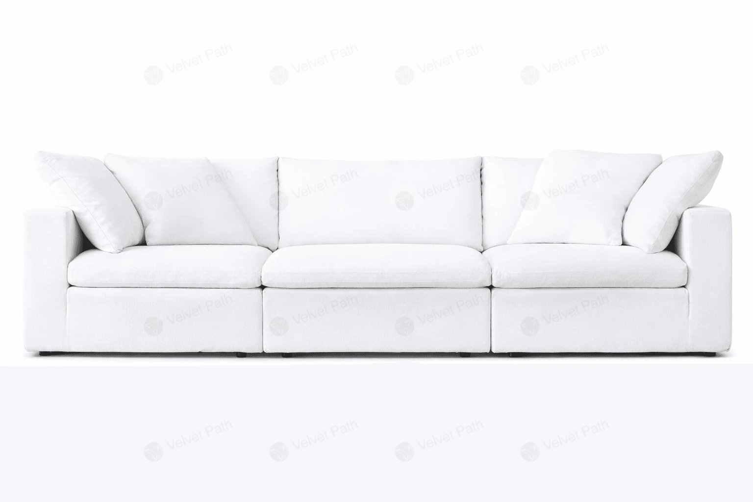 Посадочное место сформировано тремя крупными сидячими подушками, а спинка — тремя отдельными большими подушками в одном стиле. По бокам предусмотрены округлые мягкие подлокотники, которые поддерживают руки и добавляют ощущение уюта при длительном отдыхе.