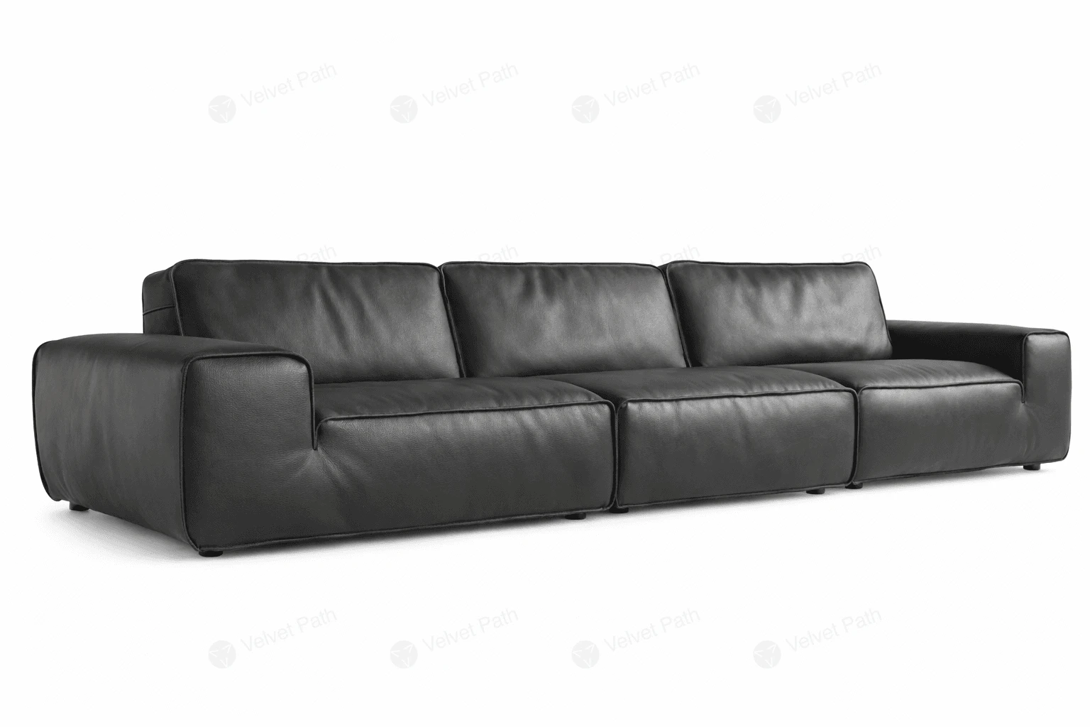 Диван выполнен на открытом основании в виде чёрной металлической рамы с низкими ножками по краям. Такой каркас подчёркивает геометрию мебели и делает силуэт визуально лёгким, при этом посадка остаётся мягкой и расслабляющей.