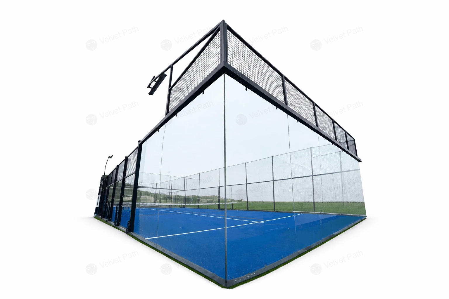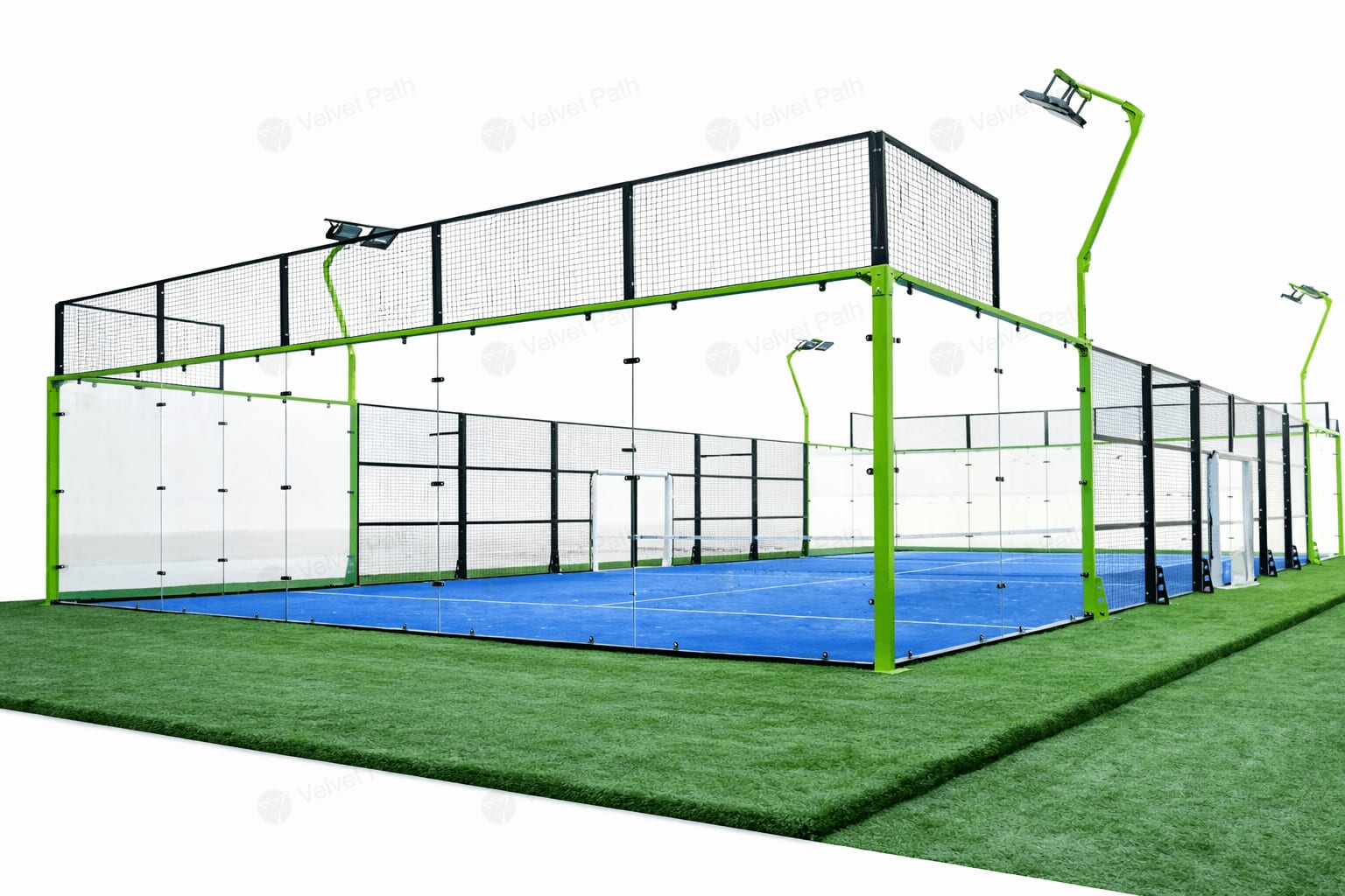 Панорамный корт для падела 20х10 м, трава 52500 игл/м2, стекло 12 мм, 8 прожекторов по 200 Вт